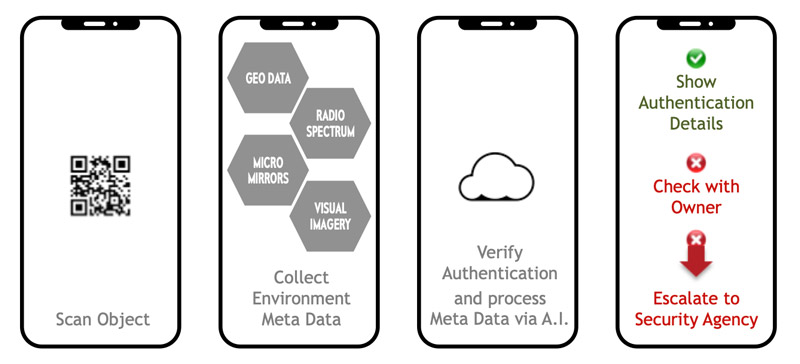 Based on observed environmental meta data and cloud provided verification details a real-time exception based reporting processes will contact the owner of the precious metal object or can escalate the event to a remote security agency monitoring service to take conclusive action and communicate directly back to the authentication initiator through the Auquin App.